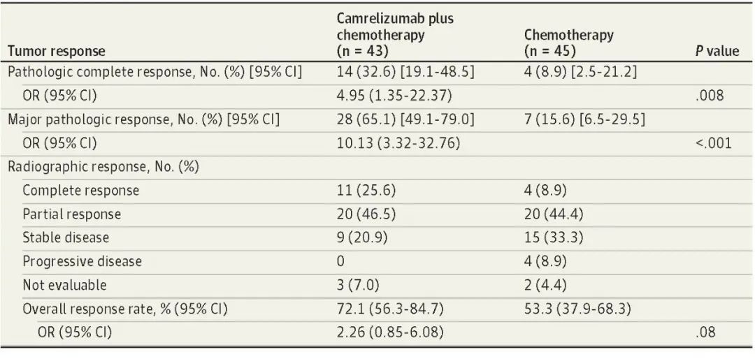 北京时间8月3日,AG庄闲医药创新药卡瑞利珠单抗联合化疗(Cam+CT)对比化疗(CT)新辅助治疗ⅢA/ⅢB (T3N2) 期非小细胞肺癌(NSCLC)结果在线发表于国际权威期刊JAMA Oncology[1]。该研究是由空军军医大学唐都医院姜涛教授、雷杰教授团队联合陕西省肿瘤医院雷光焰教授团队、兰州大学第二附属医院王成教授团队共同参与的一项随机对照、多中心、Ⅱ期临床研究(TD-FOREKNOW,NCT04338620)。研究结果显示,与化疗相比,卡瑞利珠单抗联合化疗新辅助治疗NSCLC显著提高了病理完全缓解(pCR)率(32.6% vs 8.9%,OR=4.95,95% CI :1.35-22.37, P =0 .008),且安全性良好。本研究是卡瑞利珠单抗新辅助治疗可切除NSCLC患者的首个随机对照研究,为NSCLC新辅助免疫治疗再添新证。